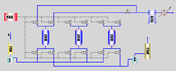 ÔÁϿ՚⽛(j¨©ng)ß^žVÈ¥·Û‰m£¬ßMÈë¹ÄïL(f¨¥ng)™CÔö‰º£¬ßMÈëÎü¸½Æ÷£¬¿ÕšâÖеÄN2, H2O¡¢CO2¼°Ì¼?x¨¬)仯ºÏÎï±»Îü¸½„©Îü¸½£¬Í¬•r«@µÃÑõšâ£¬Îü¸½ËþÎü¸½ï–ºÍºó£¬×Ô„ÓÇГQ£¬Ô“Îü¸½Æ÷œp‰º³éÕæ¿ÕÔÙÉú£¬±¾ÔO(sh¨¨)‚äÓÐÈý‚€Îü¸½Ëþ½»ÌæÊ¹Óã¬ßBÀm(x¨´)«@µÃÑõ®a(ch¨£n)Æ·£¬Ñõ®a(ch¨£n)Æ·½›(j¨©ng)ß^Ñõ‰º™C‰ºËÍÖÁÓÑô£¬Ñõ‰º™C‰ºÁ¦¿É¸ù“þ(j¨´)ÓÑôÒªÇóÔO(sh¨¨)Öá£